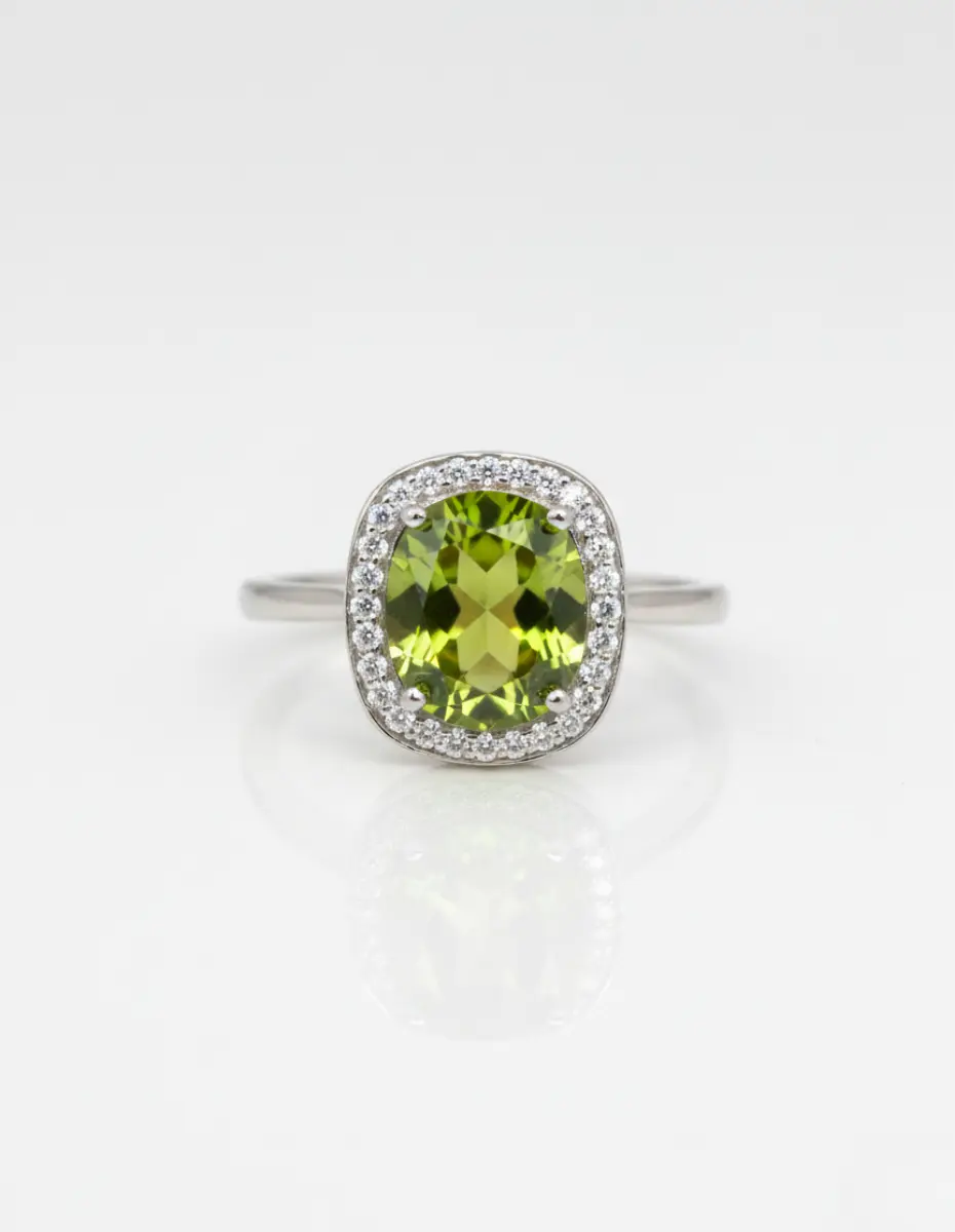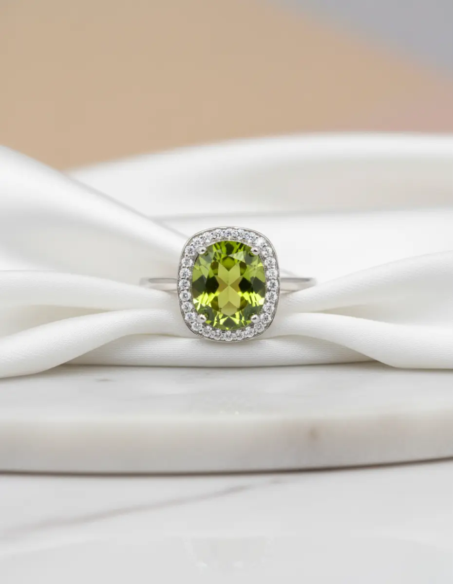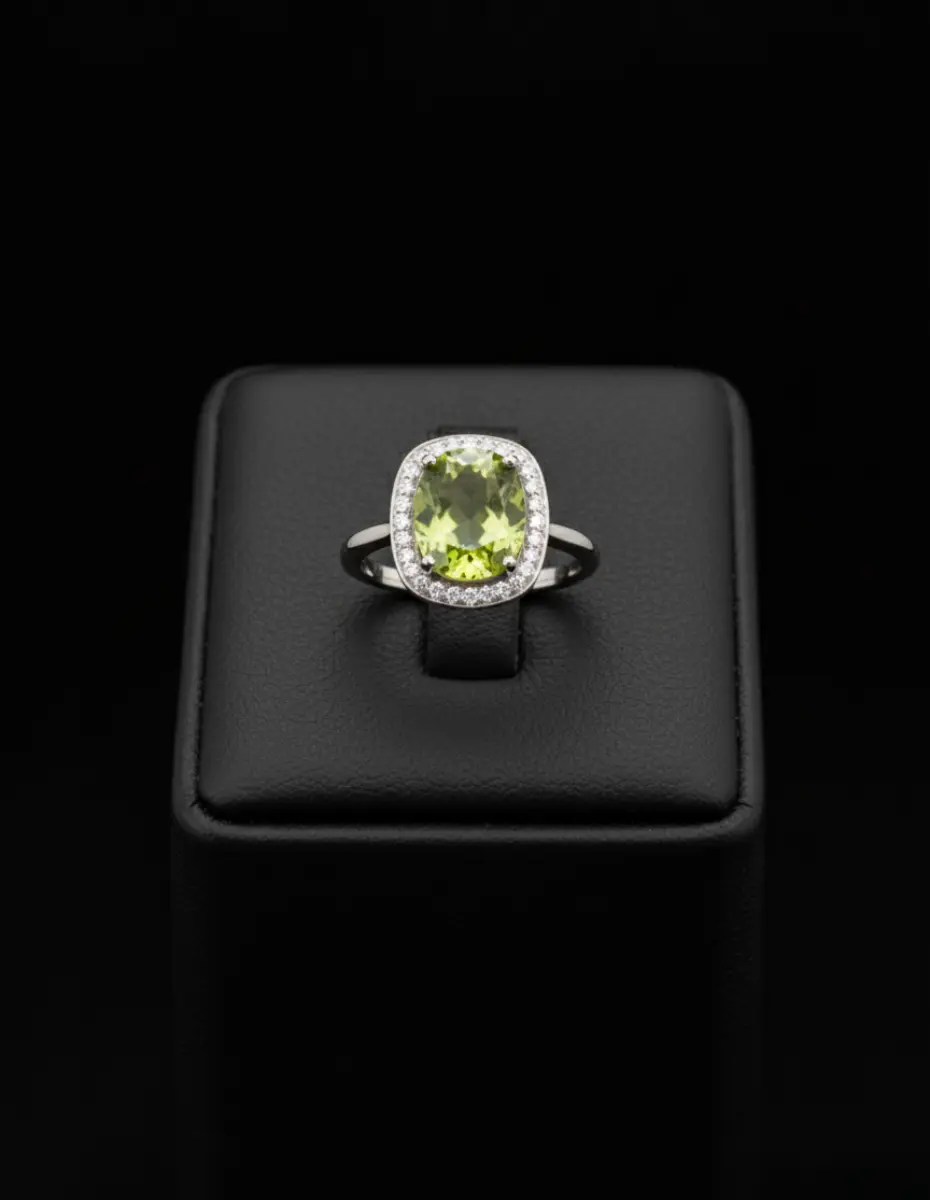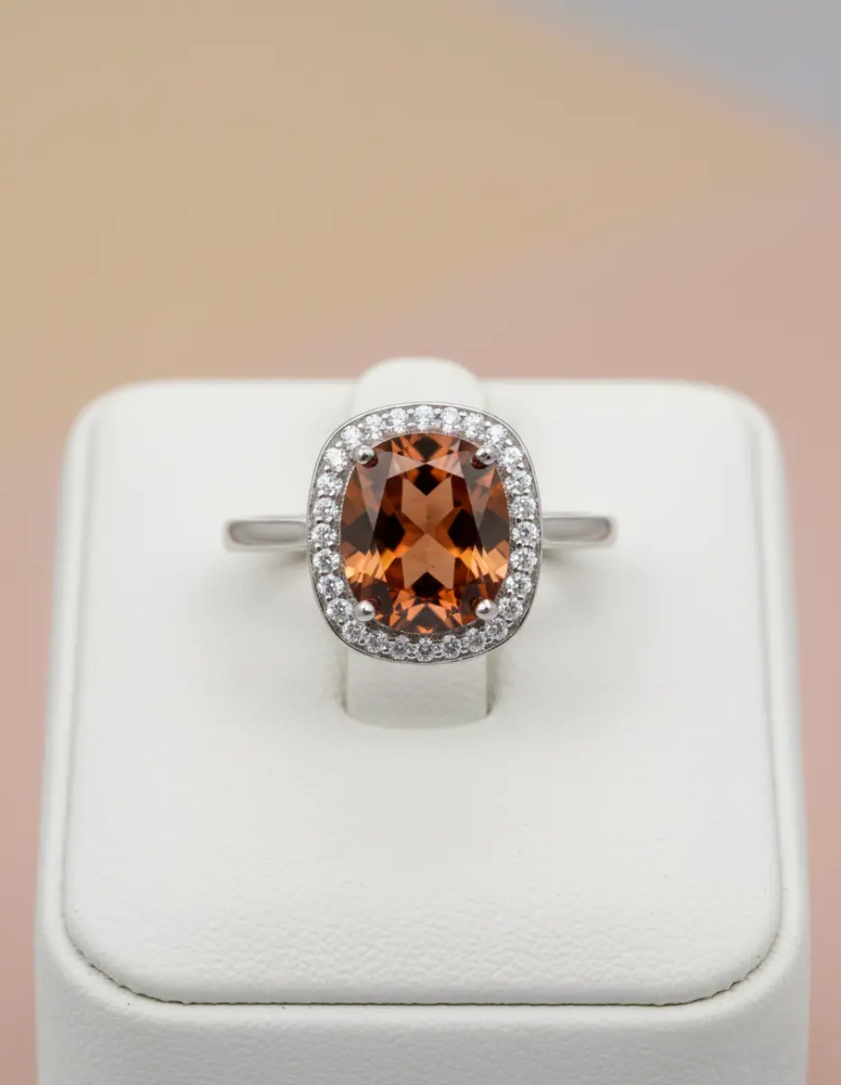 Yüksek parlaklığa sahip yastık kesim (Cushion Cut) zirkon taşı, çevresindeki küçük beyaz taşlarla birleşerek ışıltıyı en doğal şekilde yansıtır.