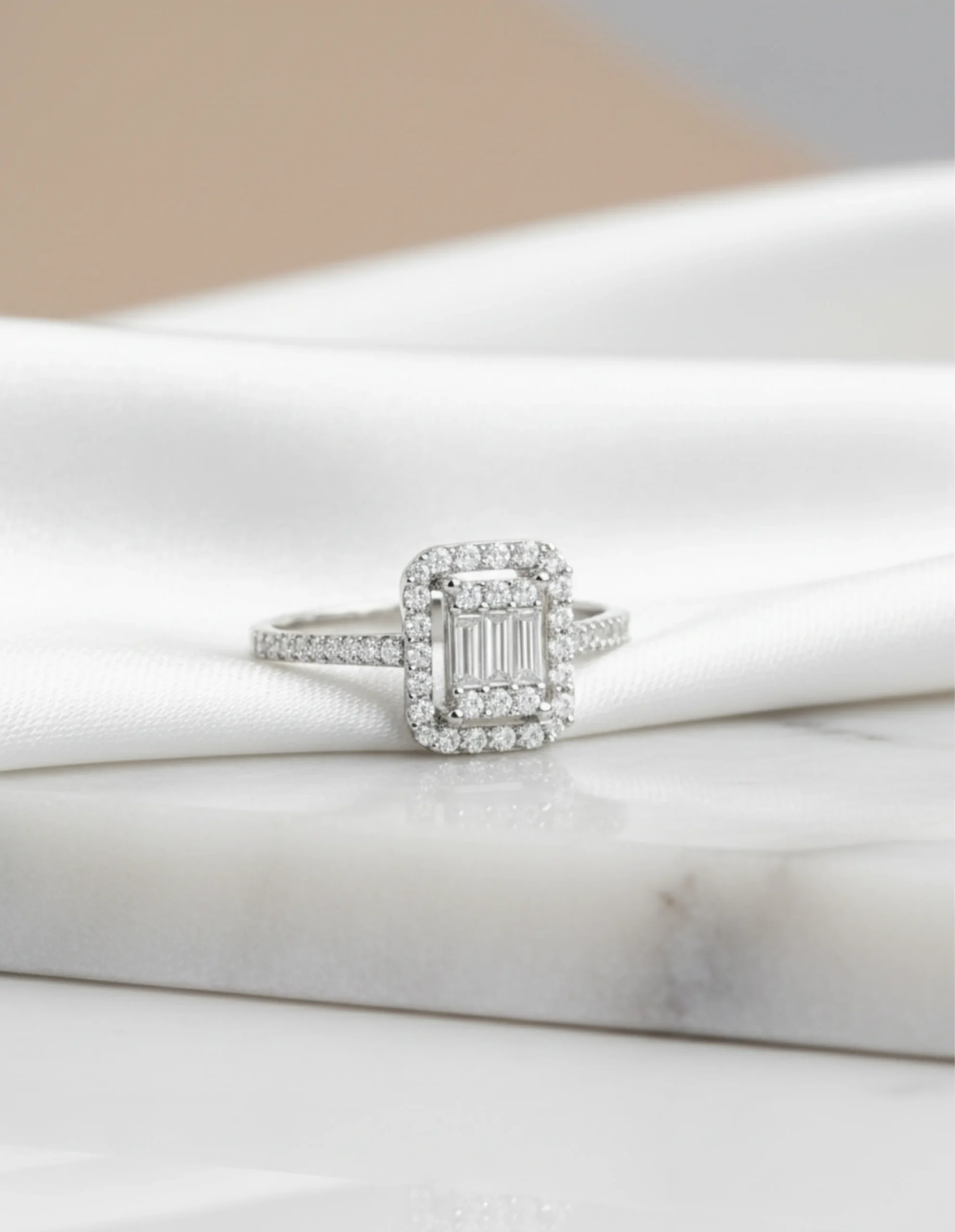 Bu ana taş grubunu çevreleyen yuvarlak zirkonlardan oluşan halo (ışık halesi) çerçevesi, yüzüğün toplam ışıltısını kat kat artırır. Bant kısmındaki pavé detaylar ise bu ihtişamı tamamlar. Bu Göz Kamaştıran baget kesim halo gümüş yüzük, nişan veya yıldönümü gibi en özel anlar için bütçenizi sarsmadan pırlanta lüksü sunan, zamansız ve romantik bir seçimdir.