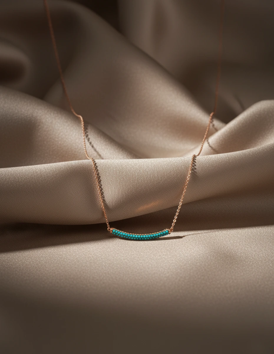 Hayatın her anını kutlayan, özel bir sembol: Turkuaz Taşlı Kavisli Bar Rose Gold Kolye. Bu eşsiz parça, rose goldun sıcak ve romantik tonunu, turkuazın okyanusları anımsatan taze enerjisiyle birleştirir. Kolyenin hafifçe kavisli, zarif bar formu, yaşamdaki pozitifliği ve sürekli akışı temsil eder; adeta boynunuzdaki küçük bir gülümsemedir.