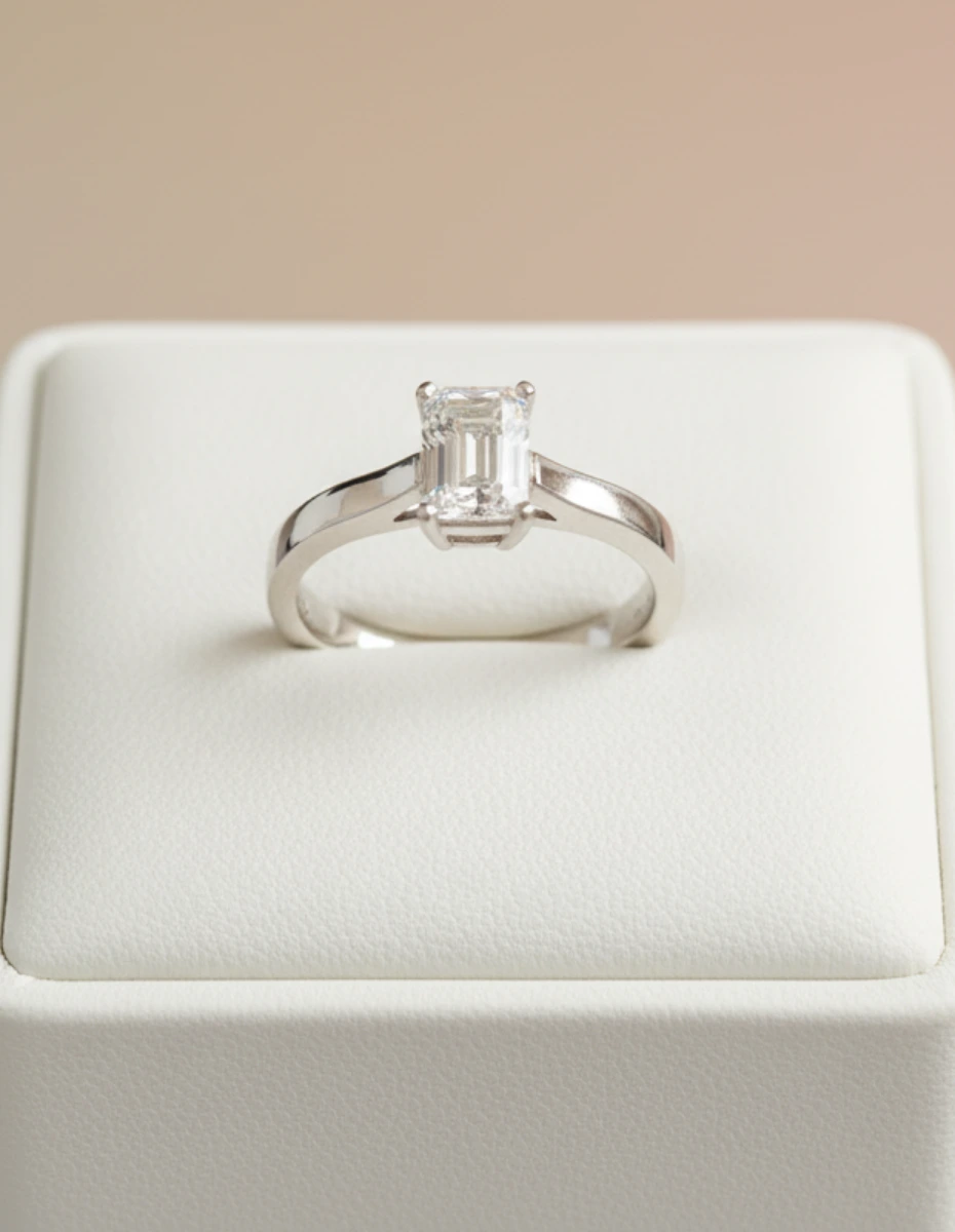 Köşeli “Emerald Cut” taş formu, sade ama etkileyici bir ışık yansıması yaratır.