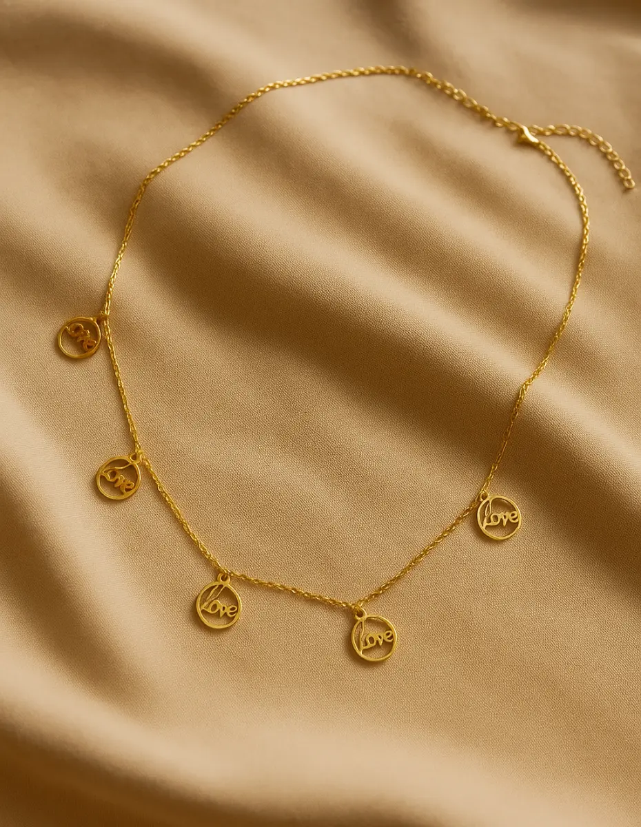 Silver 925 Love Yazılı 5 Halkalı Kadın Kolye (Gold Kaplama), Altın tonun sıcak ışıltısı, saten gibi zinciriyle birleşerek modern bir romantizm sunuyor.